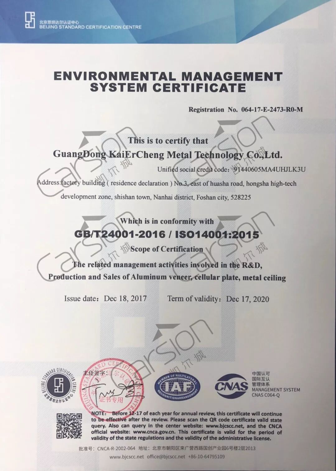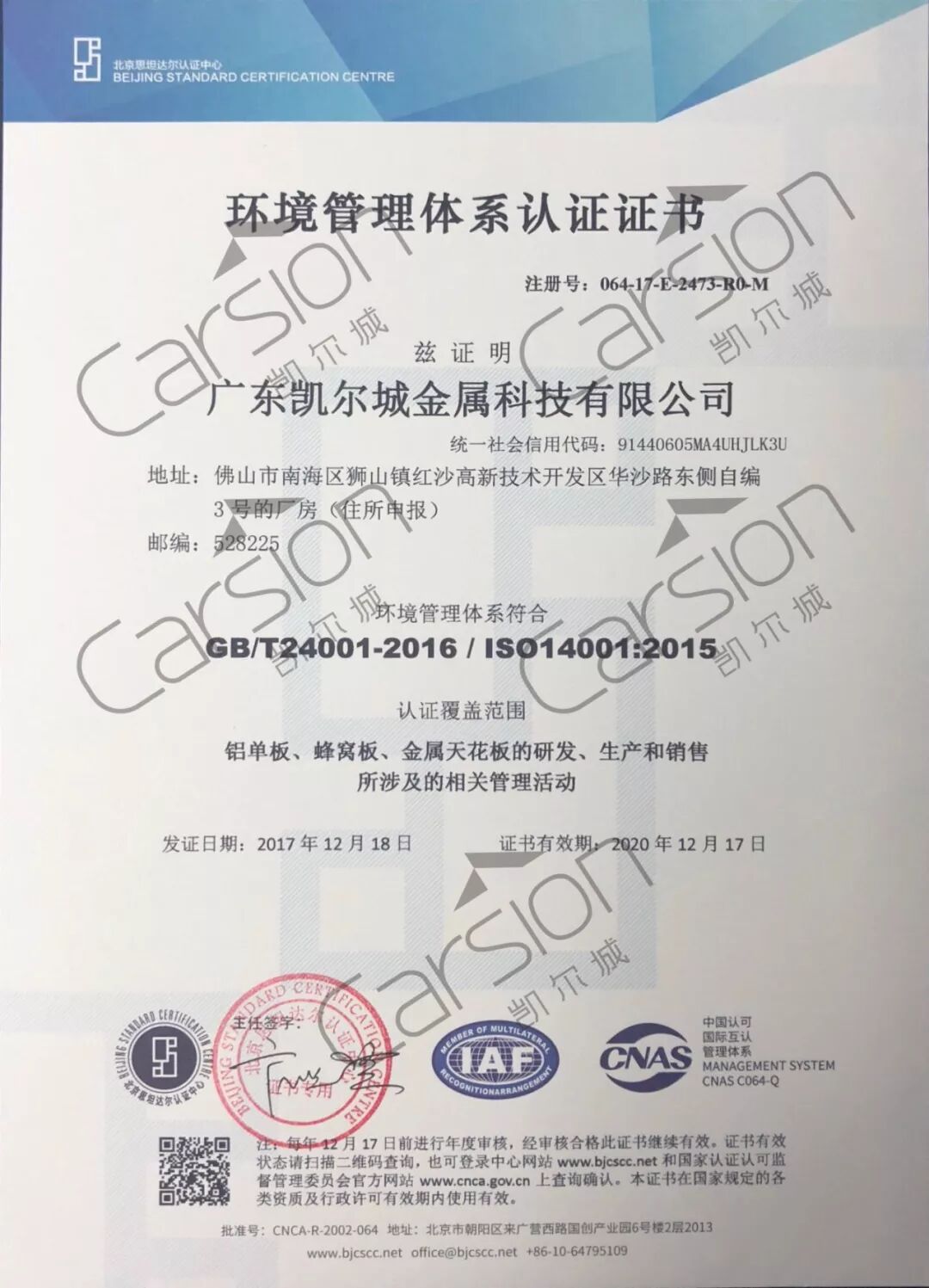 凯尔城自成立以来,就一直以标准化、严谨化、规范化作为公司的各项管理要求。在环境管理领域中努力提高管理水平,有效地促进企业环境与经济的协调持续发展,并履行相关社会责任。本次认证涵盖了公司铝单板、蜂窝板、金属天花板等系列产品板块,确保所有生产、经营活动都符合质量及环境相关法律法规的要求。
